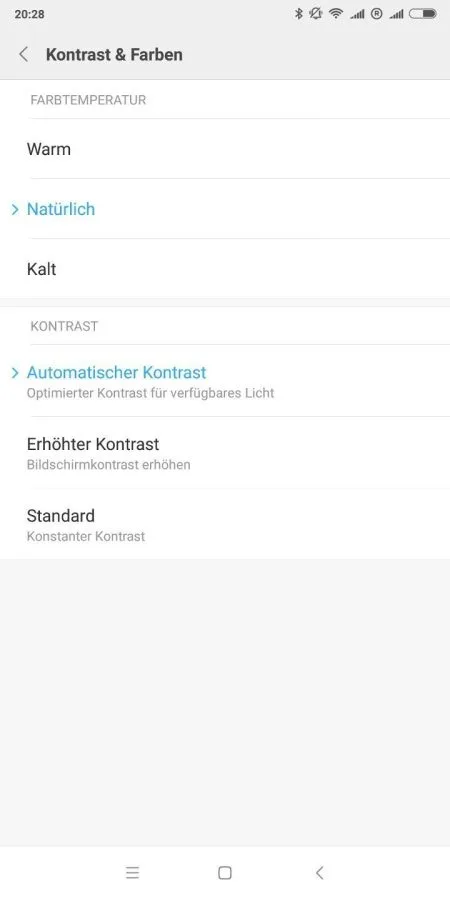 Дисплей впечатляет четкими цветами, которые почти напоминают цветопередачу дисплея AMOLED. Яркость, контрастность и цвета можно индивидуально настроить в настройках дисплея. Помимо автоматической регулировки яркости, есть также автоматическая регулировка контрастности, которая оптимизирует контраст в зависимости от доступного окружающего освещения. Датчик внешней освещенности не виден за дисплеем. Xiaomi указывает коэффициент контрастности как 1500: 1. Также на борту есть режим чтения или ночной режим, фильтрующий синий свет.
